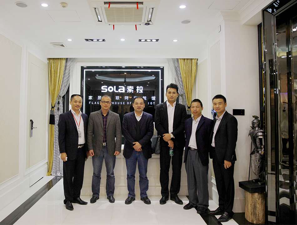 2015年12月4日,田禾集团公司段总一行莅临我司洽谈合作事宜,董事长马辉先生亲自率领索拉销售部一干人等进行了热情接待,并带领来宾参观索拉家居物联网展厅。